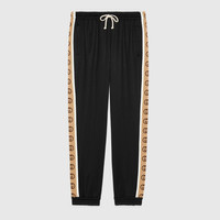 A distinctive detail of the Cruise 2020 collection, the Interlocking G stripe runs down the sides of this jogging pant, crafted from black technical jersey. Reminiscent of logo tapes typically found on vintage tracksuits, the side band serves as a sporty play on the historical Gucci logo. - Black technical jersey - White trims - Camel and brown Interlocking G jacquard stripe down the sides with reflective fabric piping - Elastic waistband with drawstring - Front zip pockets - Elastic detail at the leg opening - Loose fit - Made in Italy - The model is 6'2" and is wearing size small