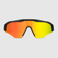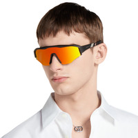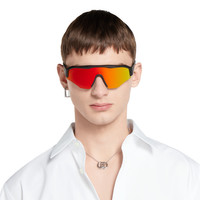 The Pre-Fall 2025 eyewear collection includes mask-shaped sunglasses with innovative shapes and striking color palettes. These mask-shaped sunglasses are presented with injection frames and a mirrored lens, enriched with a silver detail and Gucci logo. - Matte black injection frame - Matte black injection temples with silver detail and Gucci logo - Brown and orange mirrored lens - 100% UVA/UVB protection - GG2017S - Temple length: 4.7"; Lens height: 1.9"; Nose bridge length: 0.4" - Frame height 2.1"; Frame width 5.6"; Hinge to hinge 4.7" - Made in Japan - The soft black pouch is complete with an elastic drawstring, the Gucci logo and Interlocking G details.