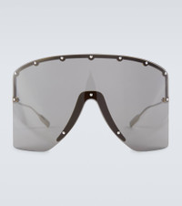These sunglasses are built with studded metal frames and gray-tinted lenses, finished at the temples with the Interlocking G logo. Gucci's iconic mask sunglasses are part of the brand's revolutionary MX collection. Please note that the color of the case may vary. Product Details - Frame color: silver - Frame material: metal - Lens color: black - comes with cleaning cloth - The color of the case may vary, comes in a case - Lens filter category 3 - Made in Italy - Item number: P00689076 Size & Fit - Lens width: 99mm-3.9" - Bridge size: 1mm-0.05" - Earpiece length: 125mm-4.9"
