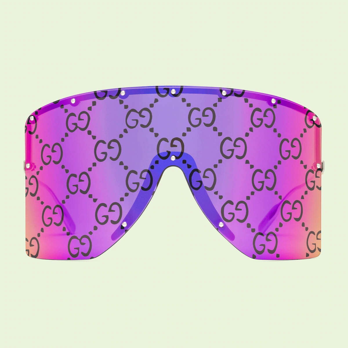 Mask sunglasses fit for glossy mountain peaks, with sporty details and technical features. Here metal studs decorate the frame, while a brown and pink Guccissima lens defines this statement accessory. This item is part of Gucci’s MX, a selection that embraces freedom of expression and explores identity norms. - Shiny yellow gold-toned metal frame with metal studs - Shiny silver-toned metal temples with Interlocking G detail - Guccissima brown and pink lens - 100% UVA/UVB protection - GG1244S - Temple length: 4.9"; Lens height: 3.3", Nose bridge length: .03" - The glasses will arrive in a velvet case, available in a range of six jewel-toned colors and paired with a coordinating satin lining. The case color will be individually selected for each pair of glasses and comes with a matching satin flannel pouch and ivory microfiber cloth.