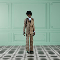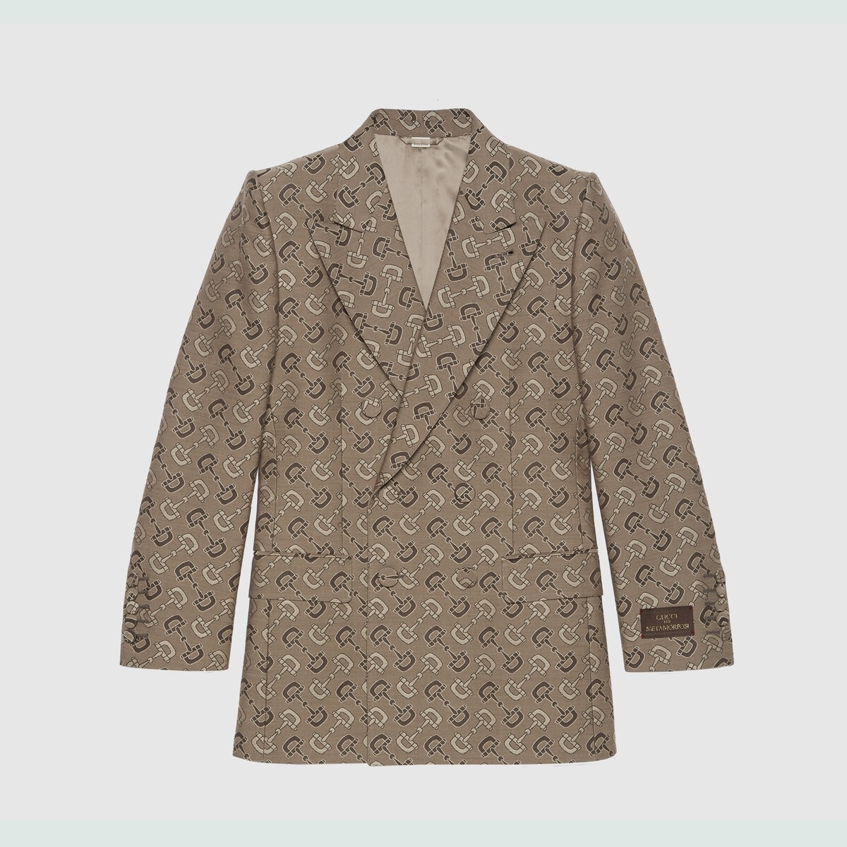 The emblematic Horsebit motif animates the ready-to-wear collection in the form of a bold all-over motif. This cotton jacket is finished with 'Gucci 1921 Metamorfosi' exposed label on the cuff. - Beige and brown maxi Horsebit cotton - 'Gucci 1921 Metamorfosi' label - Covered buttons - Fully lined - Double-breasted - Peak lapel - Full canvas construction - Strong shoulders - Length: 30", based on a size 46 (IT) - Made in Italy - The model is 6' and is wearing size 46 (IT).