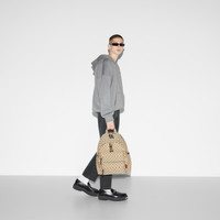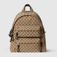 Introduced on the men's Fall Winter 2024 runway, the new backpack silhouette blends sleek lines with a sporty attitude. This version in beige and ebony Original GG canvas provides a sophisticated backdrop for the subtle Gucci logo in relief, created with a high frequency embossing technique. Other iconic details include a green and red Web detail on the outside zip pocket. - Beige and ebony Original GG canvas - Silver-toned hardware - Web detail - Brown nylon lining - Gucci logo in relief, crafted with a high frequency embossing technique - Outside: 2 front zip pockets - Inside: 1 padded laptop compartment and 1 zip pocket - Handle drop: 3.1" - 14.4"W x 15.7"H x 9"D - Weight: 2.7lbs, approximately - Made in Italy