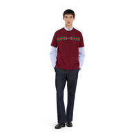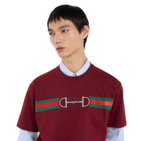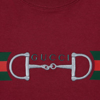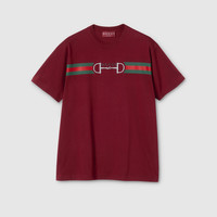 Silhouettes, fabrics, and craftsmanship draw from the House codes and speaks to the present without losing sight of the heritage. This medium cotton jersey T-shirt is defined by a Web print and a Gucci Horsebit embroidery. - Gucci Rosso Ancora red medium cotton jersey - Web print - Gucci Horsebit embroidery - Crewneck - Short sleeves - Length: 28.1"; based on a size S - Fabric: 100% Cotton - Embroidery: 100% Polyester