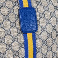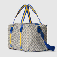 The House continues to explore its connection to the world of tennis that began in the 1970s. As a tribute to the US Open signature colors, a blue and yellow trim completes this beige and blue GG Supreme duffle bag. - Beige and blue GG Supreme - Blue leather trim - Silver-toned hardware - Blue and yellow Web - Nylon lining - Inside: 1 zip pocket - Capacity: 33.2L - Top handle with 7.8" drop - Adjustable canvas shoulder strap with 21.6" drop - Zip closure - 18.5"W x 11.8"H x 10.6"D - Weight: 3.3lbs approximately - Made in Italy