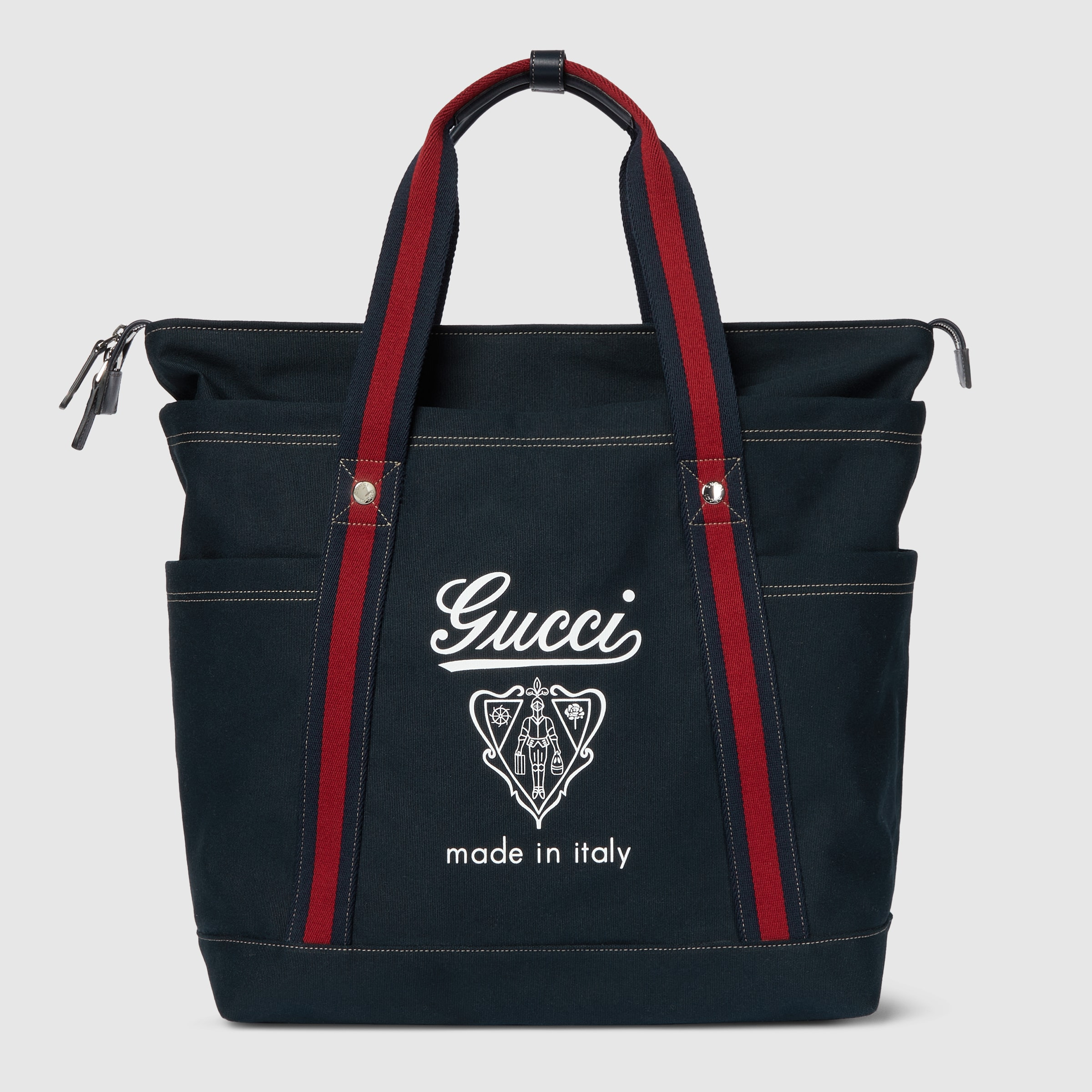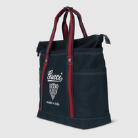 The Spring Summer 2025 men's collection speaks of freedom, energy and community through the latest selection of travel pieces and men's bags fit for new adventures. This canvas bag with a tonal leather trim and top stitch detailing, features a Gucci Made in Italy crest print across the front. - Dark brown canvas - Blue leather trim - Gucci Made in Italy and crest print - Blue and red Web - Top stitch detailing - Outside: 2 open side pockets - Handle drop: 7.5" - Zip closure - Medium: 15.3"W x 17.7"H x 7.5"D - Weight: 2.3lbs approximately - Made in Italy