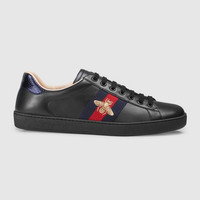 The Ace low-top sneaker in leather features the House's gold embroidered bee set against the Web. The bee is an archival code first introduced in Gucci ready-to-wear in the 1970s. - Black leather with red leather detail on the heel of one shoe and blue on the other - Blue and red Web - Gold thread-embroidered bee - Rubber sole - Flat - .6" height - Made in Italy - These shoes run big, we recommend sizing down half a size