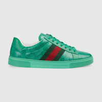 Since its debut, the Ace sneaker has become a mainstay of the House's narrative. A new version of the characteristic low-top silhouette is presented in the latest collection, featuring unique details. It's presented here in green GG Crystal canvas, while a metal “ACE” tag shines atop the lace-up closure. Gucci's distinctive green and red Web stripe completes the style. - Green GG Crystal canvas - Green and red Web - 'ACE' metal tag - Tonal rubber sole - Additional pair of laces included - Lace-up closure - Low heel - 1.2" height - Made in Italy