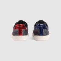 The Ace sneaker is crafted from GG Supreme canvas and further enhanced by the House Web in blue and red. Eye-catching chromatic accents, such as blue and red leather details at the back and a contrasting white sole, add a playful twist. - Black/grey GG Supreme canvas with blue leather detail on the heel of one shoe and red on the other - Blue and red Web - Rubber sole - Additional pair of laces included - Flat - .6" height - Made in Italy - These shoes run big, we recommend sizing down half a size