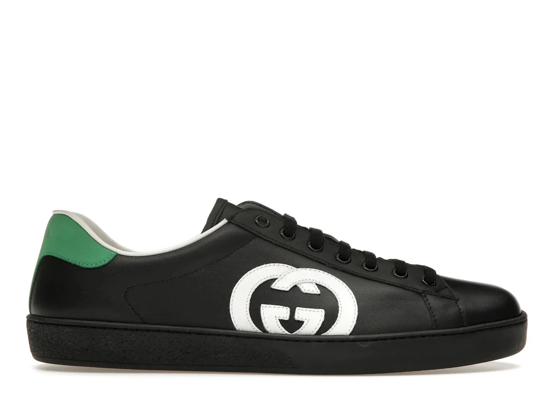 Chromatic contrast refreshes the Ace sneaker as part of the Epilogue collection. A nod to the Founder of the House, the Interlocking G logo is displayed in a crisp white tone against smooth black leather. - Black leather - Men's - White leather Interlocking G patch - Green suede detail at the back - Rubber sole - These shoes run big, we recommend sizing down one size - .6" height - Made in Italy