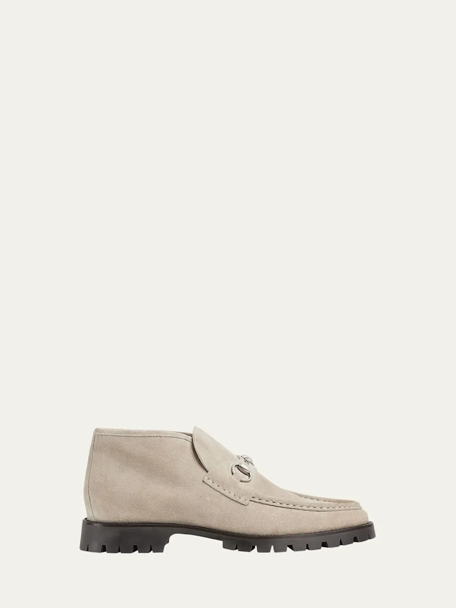 Gucci "Sylke" suede chukka boots with silvertone bit hardware Flat heel Round moc toe Laceless vamp Slip-on style Lugged rubber sole Made in Italy Online Inquiries: BGS21_NCAMW| Store Inquiries: #4843890