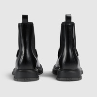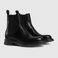 The House's signature Chelsea-style boot presents a new rubber sole with GG motif. Crafted from smooth, polished leather, this style is complete with subtle details such as textured laces and a tonal metal logo on the upper. - Black leather - Leather lining - Gucci tonal metal logo on the upper - Leather loop at the back - Padded leather insole - GG rubber sole - Flat - Height: 0.6"