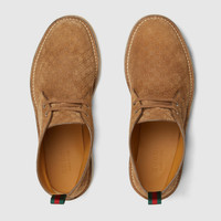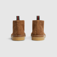 The green and red Web, a distinctive House code, embellishes this men's ankle boot style crafted in GG suede. The style is completed by a rubber sole for maximum comfort. - Camel GG suede - Web puller tag - Rubber sole - Lace-up closure - Flat - Height: 0.5"
