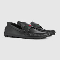 Effortless designs such as the driver shoe exude contemporary style, blending craftsmanship with comfort. Made of leather, this men's silhouette is embellished with a Web detail on the tongue. - Black leather - Unlined - Web detail on the tongue - Logo detail at the back - Rubber sole - Flat