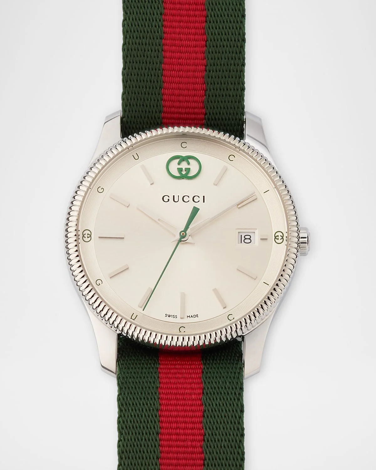 - Gucci men's watch from the G-Timeless line continues to define the latest collections, highlighting the signature motifs of the House - 38mm; round stainless steel case - Sapphire glass with antireflective coating - Silver-tone dial - Interlocking G and logo at 12 o'clock - Date window at 3 o'clock - Green and red nylon strap - Silvertone pin buckle - Quartz movement - Water resistant at 5 ATM - Made in Switzerland