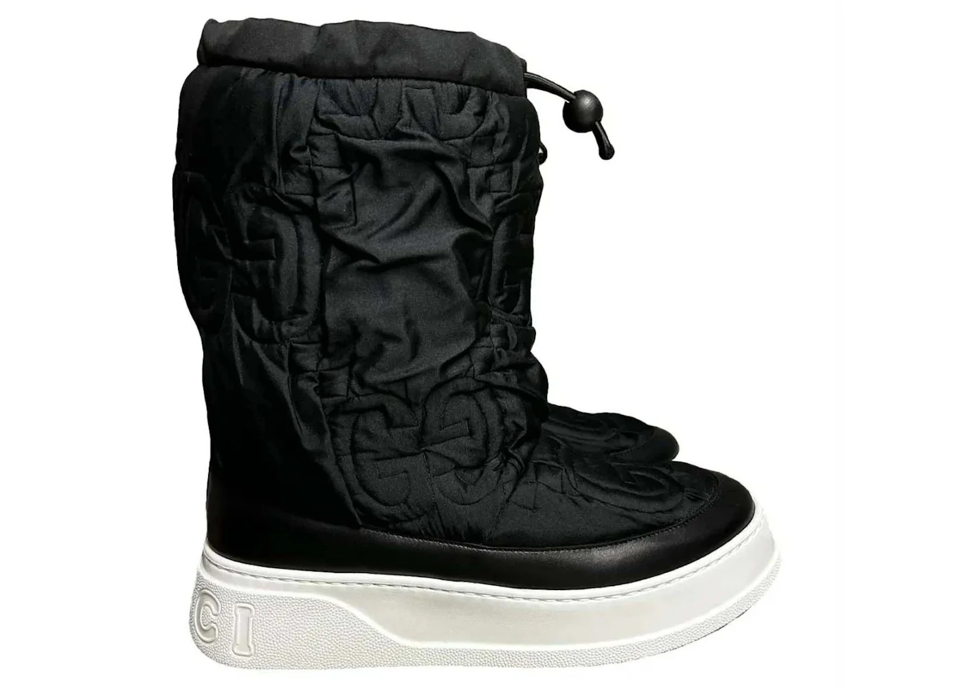 A subtle nod to the House's origins in the world of sports and leisure, outerwear continues to unexpectedly lend inspiration to the latest designs. This pair of boots is presented with a padded finish and allover GG motif. The oversize silhouette can be tightened using a drawstring, deepening the link to cold weather styles. - Black GG fabric - Men's - Padded - Drawstring detail - 'Gucci' rubber sole - Mid-heel - 2.2" height - Made in Spain