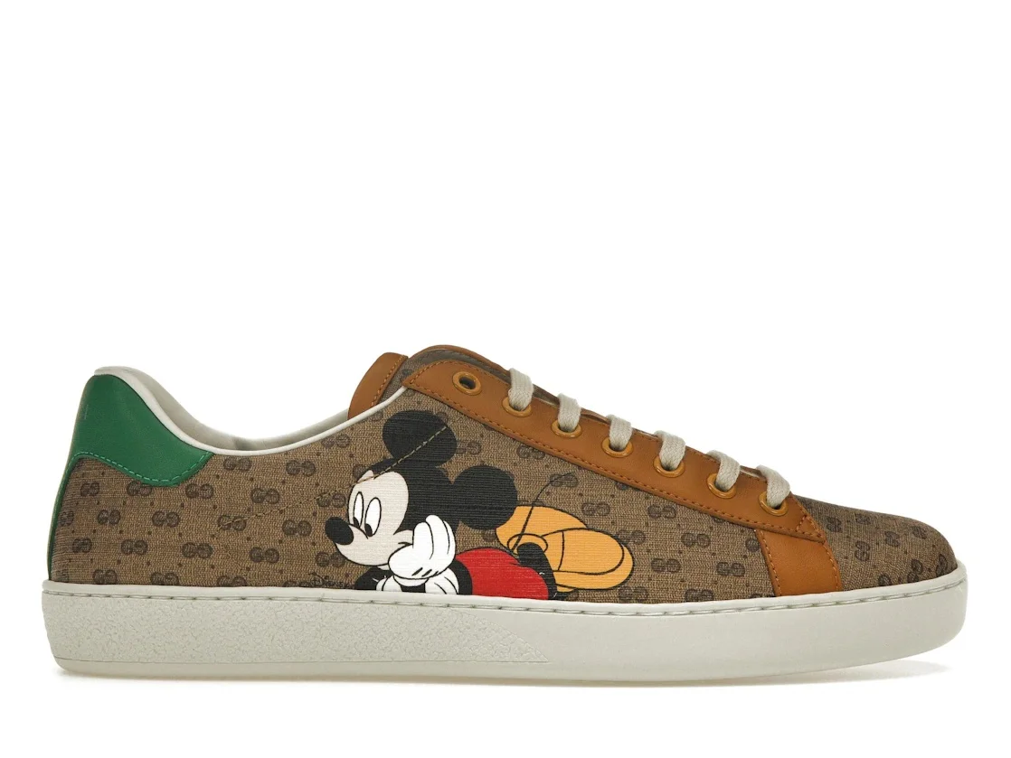 Mickey Mouse’s playful image defines this GG canvas men's sneaker, trimmed with light brown leather details that convey a vintage look and feel. In celebration of the Lunar New Year, Disney’s legendary character appears throughout Gucci’s ready-to-wear and accessories for the Cruise 2020 collection, displayed as colorful prints, embroidered patches or jacquard motifs. - Disney x Gucci ©Disney - Beige/ebony mini GG Supreme canvas with Mickey Mouse print, a material with low environmental impact - Men's - Brown leather trim - Green leather detail at the back - Rubber sole - These shoes run big, we recommend sizing down one size - .6" height - Made in Italy
