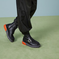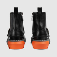 Gucci footwear reinvents traditional designs with unexpected elements. This pair of leather lace-up boots reveals a black GG nylon insert and is embellished with a leather strap with a Gucci engraved buckle. A playful splash of colour on the heel completes the look. - Black leather with black GG nylon - Men's - Leather strap with Gucci engraved buckle - Rubber sole - Lace-up detail - Zip closure - 1.6" heel height; 6.1" shaft, 10.6" circumference - all measurements based on a size 43 (IT) - Made in Italy