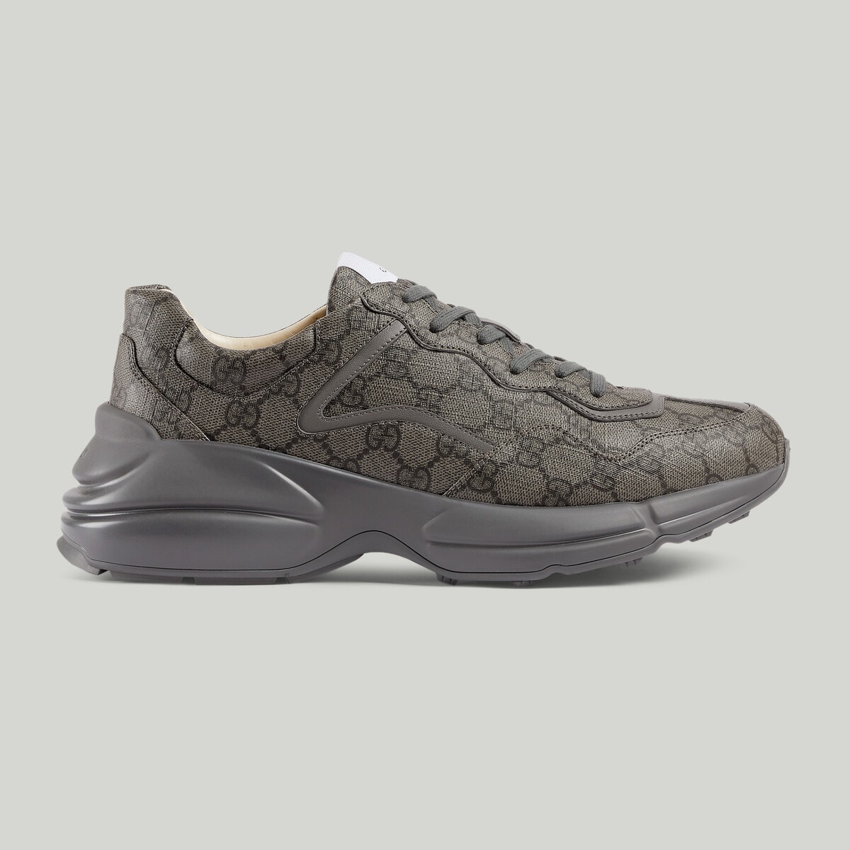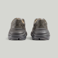 Building on its historic origins, GG Supreme is introduced in new colors and atop unexpected styles for the latest Gucci collection. The canvas has come to the front of each collection decade after decade to become a hallmark of the House. Here, this Rhyton sneaker is crafted from the material in a new shade of grey and graphite. - Grey and graphite GG Supreme - Men's - Leather detail - Gucci logo tag - Rubber sole - Additional pair of laces included - Lace-up closure - Made in Italy