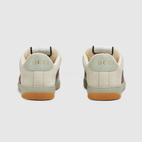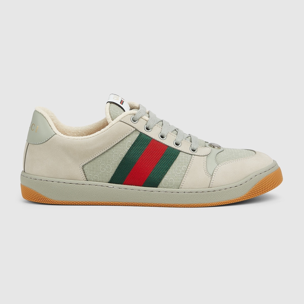 Influenced by classic trainers from the '70s, the Screener sneakers—named for the defensive sports move—feature the Web stripe on the side and the vintage Gucci logo. A new play on the House's monogram, this pair of sneakers features suede trims and the emblematic GG canvas. - Grey GG canvas - Men's - Green and red Web - Grey suede trim - Fabric lining - Oval enameled detail with metal Double G - Label with Gucci vintage logo - Bi-color rubber sole - Additional pair of laces included - Low heel - 1.4" height - Made in Italy