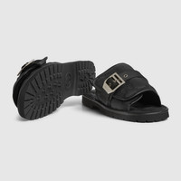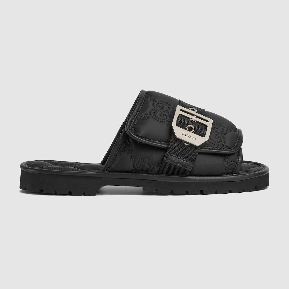 Classic styles are reimagined through the Gucci lens. This pair of slide sandals for men is crafted from unique quilted GG nylon. A rubber lug sole adds character to the style, while a canvas strap with a bold buckle defines furthermore the accessory. - Black quilted GG nylon - Men's - Leather trim - Rubber lug sole - Padded inner sole - Canvas strap with buckle - Low heel - 0.5' height - Made in Italy