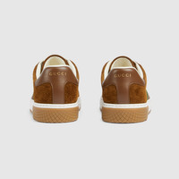 This Gucci Ace's characteristic low-top silhouette lends itself to effortless elegance. Crafted in sumptuous suede, the style presented here is complete with a metal "ACE" tag and the House's distinctive green and red Web stripe. - Brown suede - Leather lining - "ACE" metal tag - Web on the tongue - Logo on the back - Bi-color rubber outsole - Additional pair of laces in a matching color - Lace-up closure - Flat - Height: 2" - Fits true to size