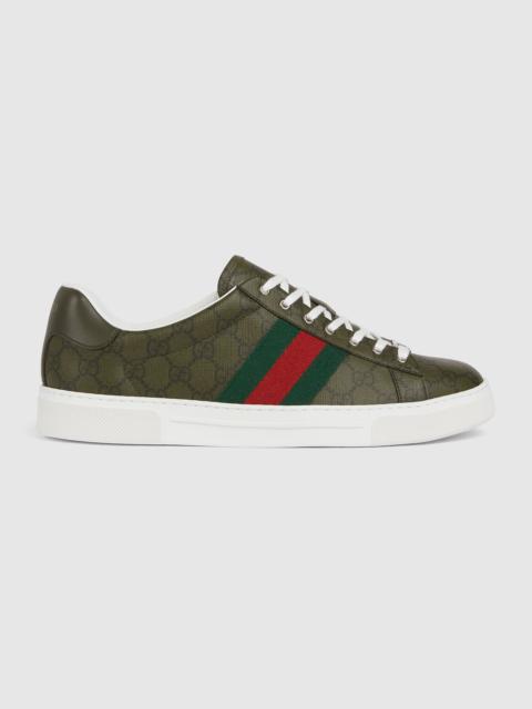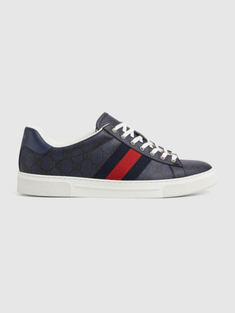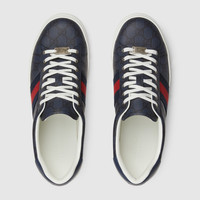 Since its debut, the Ace sneaker has become a mainstay of the House's narrative. A new version of the characteristic low-top silhouette is presented in the latest collection, featuring unique details. The GG Supreme defines the shape, while a metal “ACE” tag shines on the lace-up closure. Gucci's distinctive Web stripe completes the style. - Black GG Supreme - Men's - Blue and red Web - Leather detail - Leather lining - 'ACE' metal tag - Tonal rubber sole - Additional pair of laces included - Lace-up closure - Low heel - 1.2" height - Made in Italy - This style model fits true to size, please refer to the size guide