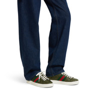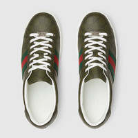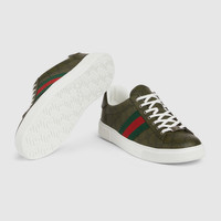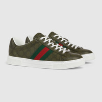 Since its debut, the Ace sneaker has become a mainstay of the House's narrative. A new version of the characteristic low-top silhouette is presented in the latest collection, featuring unique details. The GG Supreme defines the shape, while a metal “ACE” tag shines on the lace-up closure. Gucci's distinctive Web stripe completes the style. - Dark green GG Supreme - Green and red Web - Leather detail - Leather lining - 'ACE' metal tag - Tonal rubber sole - Additional pair of laces included - Lace-up closure - Low heel - 1.2" height - Made in Italy - This style model fits true to size, please refer to the size guide