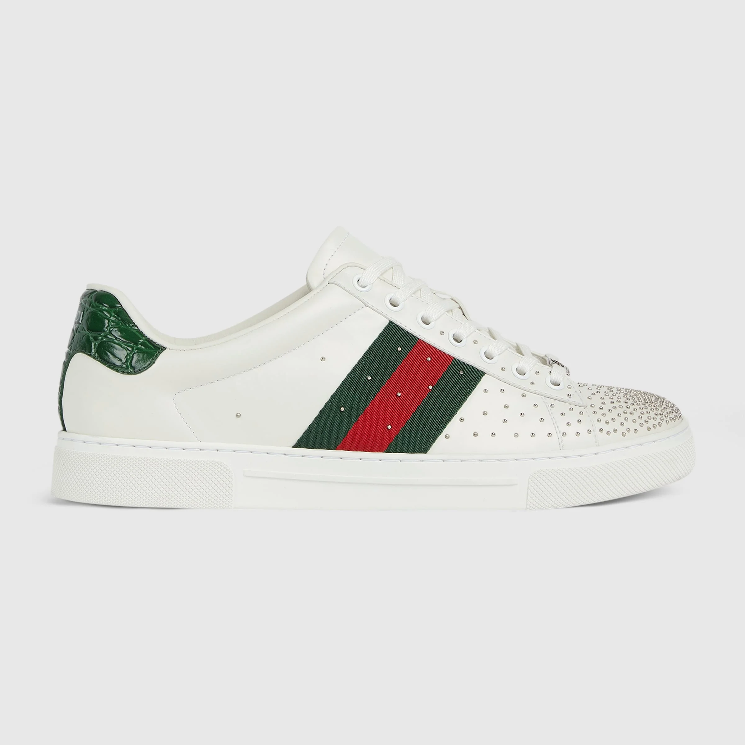 The Gucci Ace's characteristic low-top silhouette features unique details. This style is intricately embellished with fine studs that create a gradient effect on the upper for a sparkling touch, complete with a metal "ACE" tag and the House's distinctive green and red Web stripe. - White leather with gradient studs - Green and red Web - Leather lining - "ACE" metal tag - Logo on the back - Rubber sole - Additional pair of laces included - Lace-up closure - Flat - 0.04" height - Fits true to size