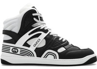 Sporting a look synonymous with basketball sneakers from the ‘90s, the House presents new interpretations of the Gucci Basket sneaker. This style emulates the self-expression of on-court aesthetic with distinctive features and detailing. Each pair is crafted primarily from Demetra, created with the same processes used for tanning, the new material offers pliable and resilient performance with a supple finish. The eco-friendly material combines animal-free raw materials primarily from sustainable, renewable, and bio-based sources. - Black and white Demetra—crafted from animal-free raw materials that are primarily from sustainable, renewable, and bio-based sources with green rubber details - Men's - White perforated and fabric details - Rubber Interlocking G patch - Contrast padding at the ankle - Gucci logo detail - Rubber Interlocking G at the side - Additional pair of laces included - Rubber sole - Lace-up closure - Made in Italy