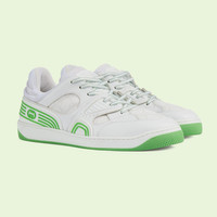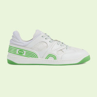 Sporting a look synonymous with basketball sneakers from the ‘90s, the House introduces the newest rendition of the lace-up sneaker—Gucci Basket. This low top style emulates the self-expression of on-court aesthetic with distinctive features and detailing. Presented in grey with green accents and finished with a lightly distressed effect, each pair is crafted primarily from Demetra. Created with the same processes used for tanning, the new material offers pliable and resilient performance with a supple finish. The eco-friendly material combines animal-free raw materials primarily from sustainable, renewable, and bio-based sources. - White Demetra—crafted from animal-free raw materials that are primarily from sustainable, renewable, and bio-based sources with green rubber details and purple mesh - Men's - White GG Supreme canvas - Green rubber details - Rubber Interlocking G logo - Rubber sole - Lace-up closure - Flat - Made in Italy