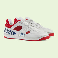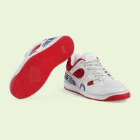 Sporting a look synonymous with basketball sneakers from the ‘90s, the House introduces the newest rendition of the lace-up sneaker—Gucci Basket. This style emulates the self-expression of on-court aesthetic with distinctive features and detailing. Presented in white and finished with a lightly distressed effect, each pair is crafted primarily from Demetra. Created with the same processes used for tanning, the new material offers pliable and resilient performance with a supple finish. The eco-friendly material combines animal-free raw materials primarily from sustainable, renewable, and bio-based sources. - White Demetra—crafted from animal-free raw materials that are primarily from sustainable, renewable, and bio-based sources. - Men's - Reflective trim - Red mesh - Rubber sole - Rubber Interlocking G at the side - Lace-up closure - Flat - Made in Italy - Treated for a distressed effect