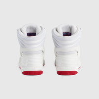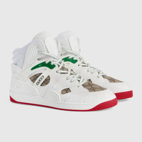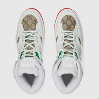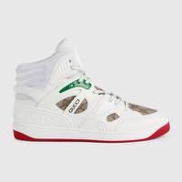 Sporting a look synonymous with basketball sneakers from the ‘90s, the House introduces the newest rendition of the lace-up sneaker—Gucci Basket. This high-top style emulates the self-expression of on-court aesthetic with distinctive features and detailing. The high top sneaker is crafted from a mix of GG Supreme canvas and white Demetra. Created with the same processes used for tanning, the new material offers pliable and resilient performance with a supple finish. The eco-friendly material combines animal-free raw materials primarily from sustainable, renewable, and bio-based sources. - White Demetra—crafted from animal-free raw materials that are primarily from sustainable, renewable, and bio-based sources - Men's - Beige and ebony GG Supreme canvas - White rubber details - Rubber Interlocking G patch - Contrast padding at the ankle - Gucci logo detail - Rubber Interlocking G at the side - Lace-up closure - Low heel - 1" height - Made in Italy - Treated for a distressed effect