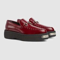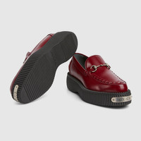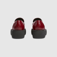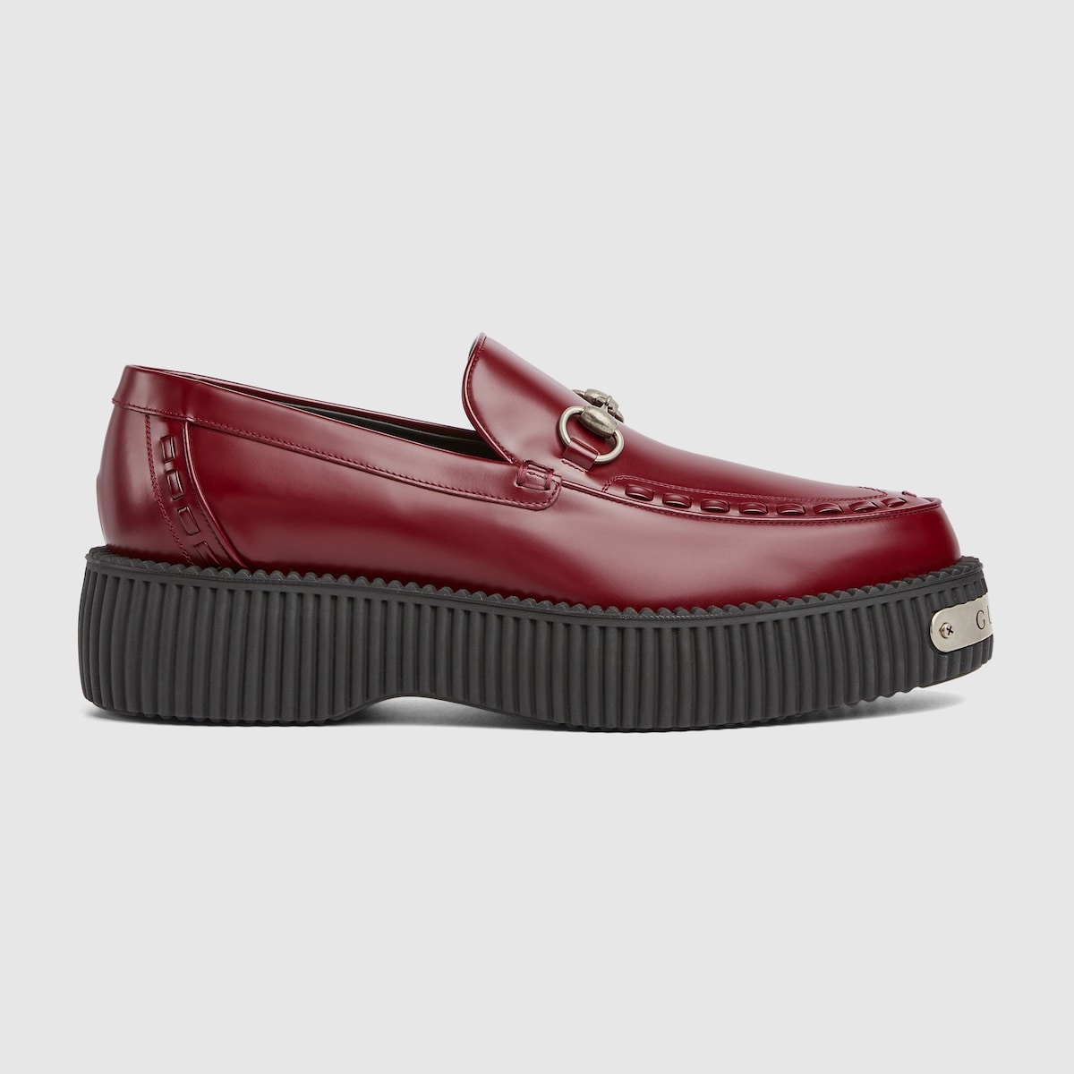 Introduced on the men's Fall Winter 2024 runway, the Gucci Horsebit creeper combines a thick ridged sole with subtle design details, from the equestrian hardware to the logo metal plaque. Through its shape and construction, this loafer model in Rosso Ancora red leather draws on classic silhouettes while exuding a contemporary attitude. - Gucci Rosso Ancora red leather - Men's - Silver-toned hardware - Horsebit - Gucci metal plaque detail - Creeper rubber sole - Almond toe - Flat - Height: 2.1" - Made in Italy
