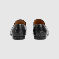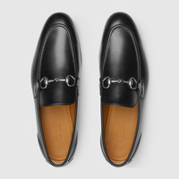 The Jordaan loafer with Horsebit, representative of Gucci heritage, speaks of classic elegance. This model crafted in refined black leather is completed with a new insole with extra cushioning, ensuring maximum comfort. - Black leather - Men's - Silver-toned hardware - Horsebit - Insole with extra cushioning - Leather sole - Flat - Height: 0.5" - Made in Italy