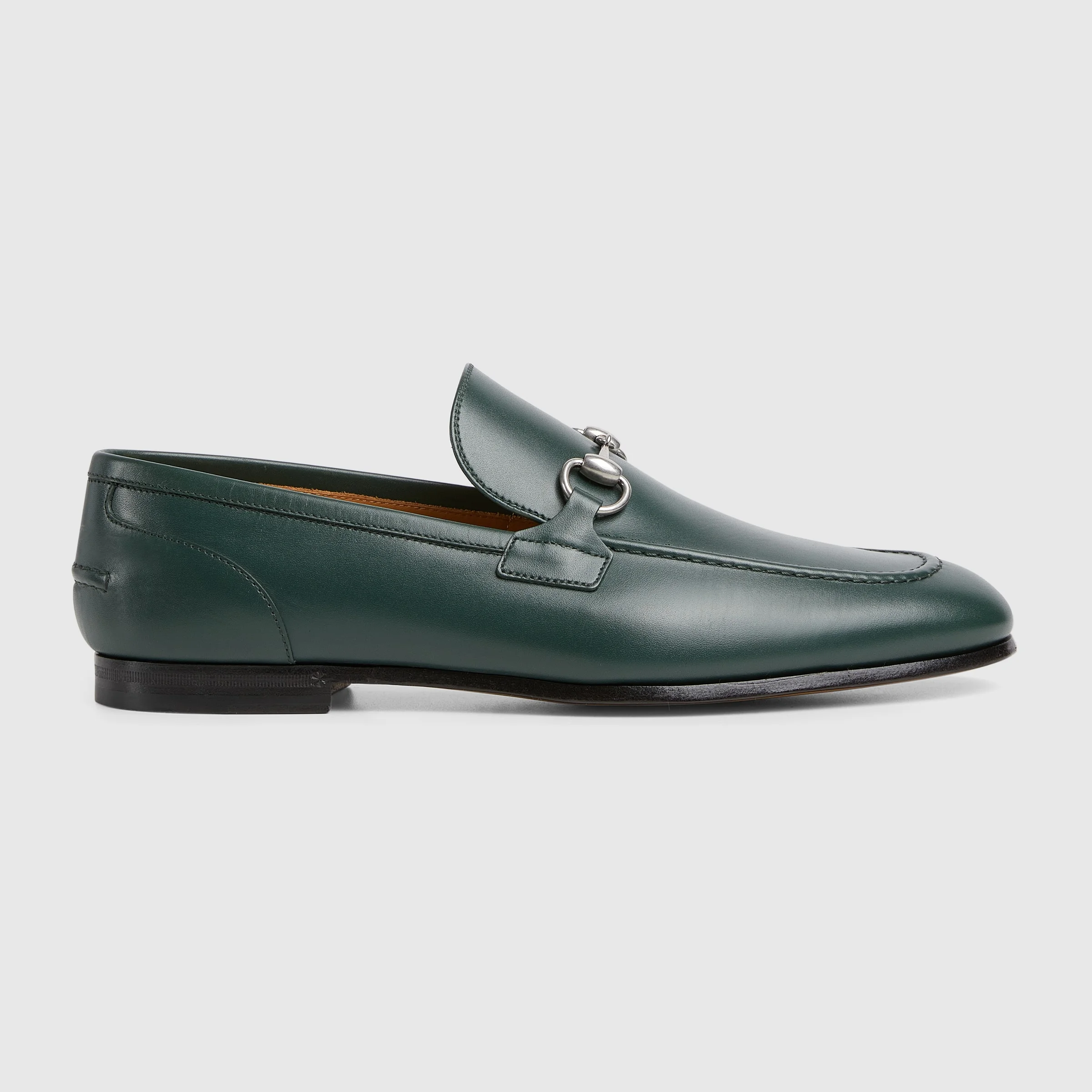 The Jordaan loafer with Horsebit, representative of Gucci heritage, speaks of classic elegance. This model crafted in refined leather is completed with a new insole with extra cushioning, ensuring maximum comfort. - Dark green leather - Silver-toned hardware - Horsebit - Insole with extra cushioning - Leather sole - Flat - Height: 0.5" - Made in Italy