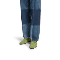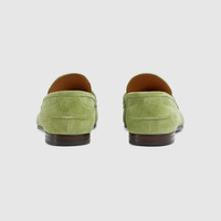 In the Spring Summer 2025 collection, this Gucci Jordaan loafer, defined by its distinctive elongated toe and sleek silhouette, is crafted from green suede and enriched with historic codes of the House. - Blake construction - Green suede - Men's - Silver-toned hardware - Leather lining - Horsebit detail - Leather sole - Flat - .4" heel - Made in Italy