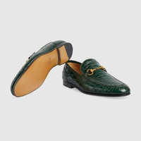 Precious materials create a new approach towards formal styles. This pair of Horsebit loafers is presented in green crocodile. The style is crafted with a Blake construction to give a comfortable, lightweight fit. - Blake construction - Green crocodile - Men's - Gold-toned hardware - Horsebit detail - Leather sole - Flat - .4" heel - Made in Italy