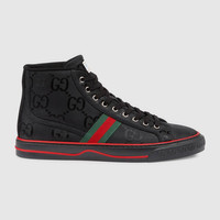 Part of the Gucci Tennis 1977 collection, the high-top sneaker is introduced within a line of accessories and ready-to-wear presented for Pre-Fall 2020 made from recycled materials and trims, supporting the House's commitment to sustainability. Gucci Off The Grid is the first collection from Gucci Circular Lines—a concept created to support the House's vision for circular production. Gucci Off The Grid uses recycled, organic, bio-based and responsibly sourced materials. Regenerated nylon, crafted using recycled sewing thread and trims displays the GG pattern against an opaque background in black. - Black GG nylon made from ECONYL®— regenerated nylon - Men's - Green and red Web stripe made from recycled polyester - Black contrast details made from - Eyelets made from recycled steel with recycled polyester laces - Gucci Tennis 1977 label made from recycled polyester - GG motif at the sole - "77" embroidery - Rubber sole - Additional pair of laces included - Flat - 0.8" height - Made in Italy - This product has not been made using materials of animal origin