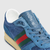 The Gucci Re-Motion sneaker blends classic with contemporary elements. Crafted from blue Original GG canvas, the model is completed with the signature green and red Web. The lightweight, flexible outsole has gone through a special treatment to create a retro appeal. - Blue Original GG canvas - Suede trim - GG nylon - Green and red Web - Rubber outsole with Interlocking G and Gucci script logo - Interlocking G details on the eyelets - Tongue with 3D Gucci script logo and Interlocking G, created with a high-frequency embossing process - Lace-up closure