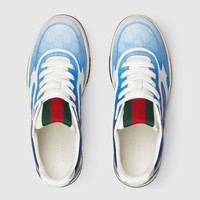 The Re-Web sees Gucci’s heritage stripes as a bold statement detail on a contemporary silhouette. Defined by signature details, this pair of sneakers is crafted from gradient blue GG Supreme and completed with green and red Web tongue. - Gradient blue GG Supreme - Rubber outsole with Interlocking G and Gucci script logo - Interlocking G details on the eyelets - Tongue with Web - Additional pair of laces included - Lace-up closure - Low heel - Height 1.3" - Made in Italy - This style runs big, we recommend sizing down