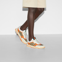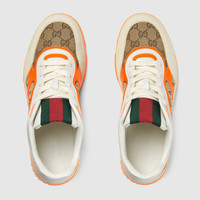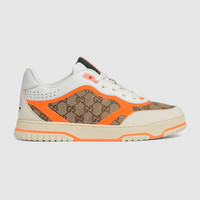 Inspired by the summer spirit and beach clubs on the Italian coast, this item is part of Gucci Lido. The first sneakers envisioned by Sabato De Sarno for the House, the Re-Web sees Gucci’s heritage stripes as a bold detail on a contemporary silhouette. This pair is crafted from the iconic Original GG canvas and white leather. Defined by multiple iconic details, this new sneaker takes center stage with the bold green and red Web tongue and bright orange leather trim. - Beige and ebony Original GG canvas - Men's - Bright orange leather trim, treated with a specific process to make it soft and shiny, while the grainy texture is given by embossing - Gucci script and Interlocking G Web tag - Rubber outsole with Interlocking G and Gucci script logo - Interlocking G details on the eyelets - Tongue with Web - Additional pair of laces included - Lace-up closure - Low heel - 1.3" height - Made in Italy - These shoes run big, we recommend sizing down half a size