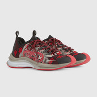 Designs inspired by the sporting world are interpreted through the Gucci lens with standout logo details. This pair of streamlined sneakers is crafted from GG technical knit fabric and defined by the Interlocking G. A bi-color sole completes the style with a playful note of chromatic contrast. - Black and red GG technical knit fabric - Men's - Rubber Interlocking G detail - Gucci at back outersole - Bi-color rubber sole - Lace-up closure - Low heel - Made in Italy