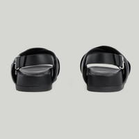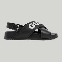 Presented in smooth black leather with a minimalist design, this sandal is further enriched with a contrasting Gucci script across the crossover strap. The buckle strap closure hugs the contours to ensure comfort whilst maintaining a sleek aesthetic. - Black leather - Men's - White leather trim - Gucci script - Rubber sole - Buckle closure - Flat - Made in Italy