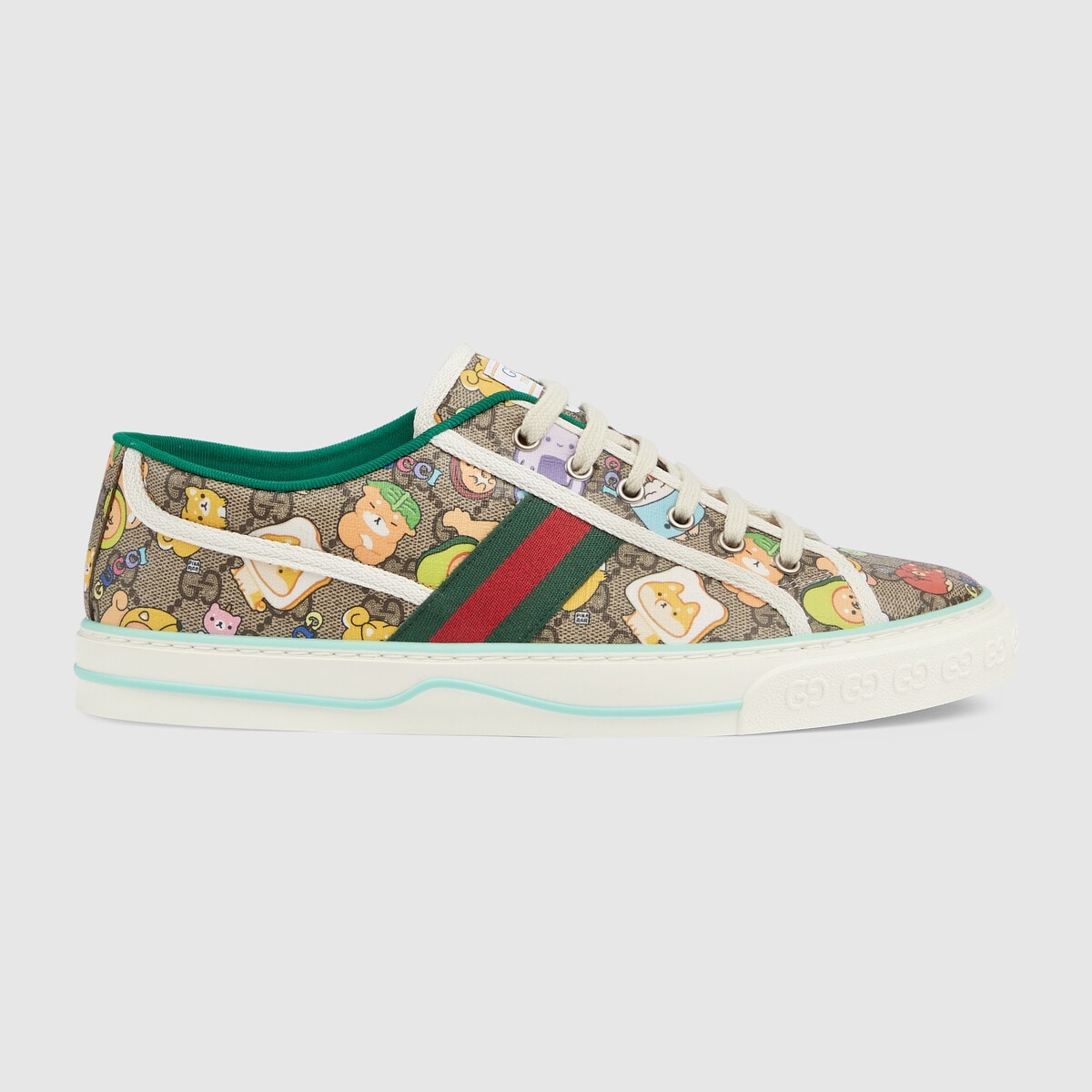 The artwork by America-based illustrator and designer, Angela Nguyen, also known as 'Pikarar', adds a playful touch to ready-to-wear pieces and accessories with vibrant prints or embroideries inspired by pop culture, anime, and animals. Here this Gucci Tennis 1977 is defined by a GG animal print. - Gucci animal print beige and ebony GG Supreme canvas - Men's - Green and red Web - Artwork by Angela Nguyen 'Pikarar' - White contrast details - GG motif at the sole - Gucci Tennis 1977 label - Rubber sole - Lace-up closure - Flat - Made in Italy