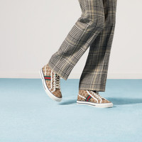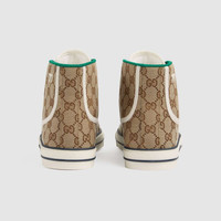 The Gucci Tennis 1977 sneaker is presented in a high-top version for the Pre-Fall 2020 collection. The sneaker is crafted from a monogram canvas that combines with the textured GG motif at the sole and the House Web. The style is finished with a dedicated label with the name of the line and a subtle embroidered detail of the number 77. - Beige/ebony original GG canvas - Men's - Green and red Web - White contrast details - Green grosgrain trim - Gucci Tennis 1977 label - GG motif at the sole - "77" embroidery - Rubber sole - Additional pair of laces included - Lace-up closure - Flat - .8" height - 5" boot shaft height, measurements based on a size 43 (IT) - Made in Italy - This product has not been made using materials of animal origin