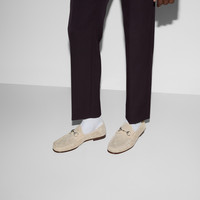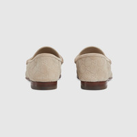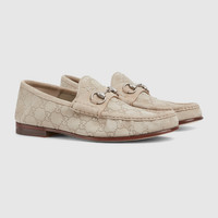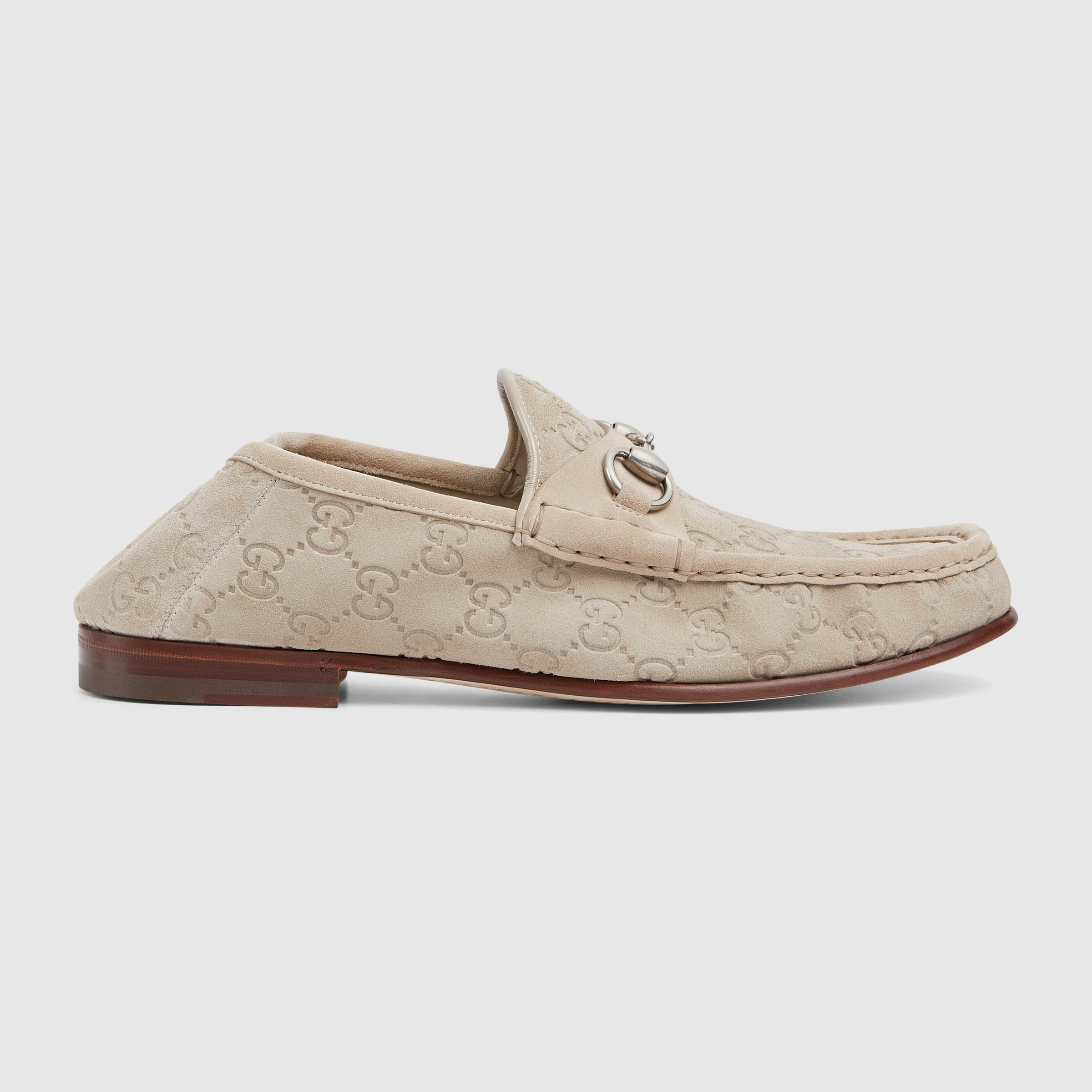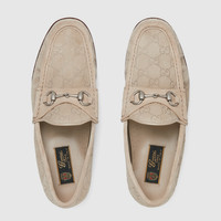 Defined by an elegant silhouette, this man's loafer is crafted in refined GG suede, an emblematic and modern material. The style is completed by the unique Horsebit with a silver finish. - Oatmeal GG suede - Men's - Silver-toned hardware - Leather lining - Horsebit - Leather sole - Height: 0.5" - Made in Italy