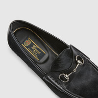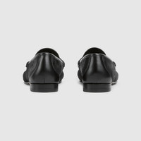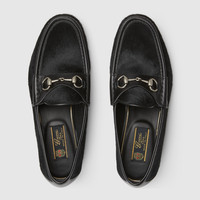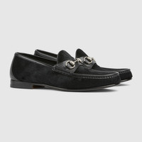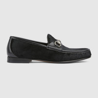 One of the House's unique styles, the Gucci loafer is presented here crafted in smooth suede and defined by a tonal leather trim. The style is completed by the emblematic Horsebit with a silver finish. - Black suede - Black leather trim - Silver-toned hardware - Horsebit - Leather sole - Flat - Height: 0.5" - Made in Italy