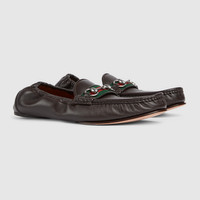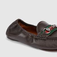 Presenting this new flexible style, the Horsebit 1953 loafer is reimagined with a 2-piece leather sole and an elastic shoe collar for effortless elegance and wearability. The style is complete with the emblematic hardware in silver-toned finish. - Dark brown soft leather - Green and red Web trim - Silver-toned hardware - Leather lining - Horsebit - Elasticized shoe collar - 2-piece leather sole with maximum flexibility - Gucci logo metal plate on the bottom - Flat - Height: 0.2"