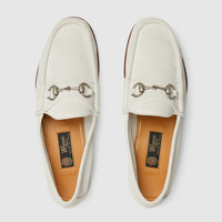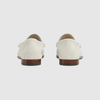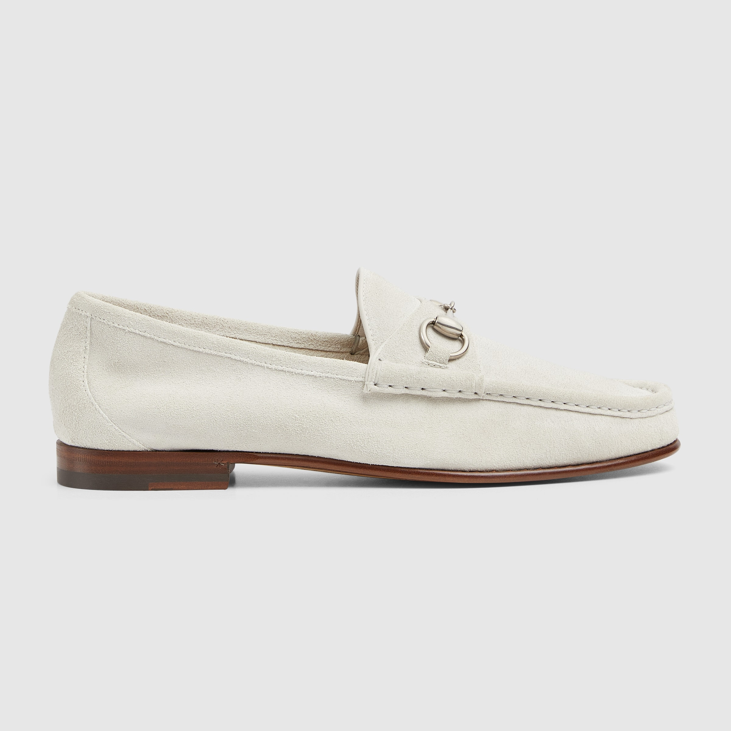 In the Spring Summer 2025 collection, this man's Horsebit 1953 loafer is crafted from refined light grey suede. Defined by an elegant silhouette, the accessory is finished with the unique Horsebit in a silver tone. - Light grey suede - Men's - Silver-toned hardware - Leather lining - Horsebit - Leather sole - Height: 0.5" - Made in Italy
