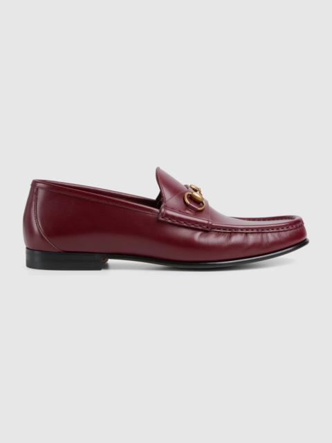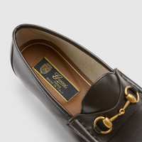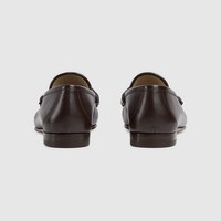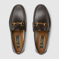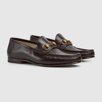 Modern interpretations of archival symbols both pay tribute to Gucci's heritage while looking towards the future. This pair of leather loafers reimagines the emblematic loafer with Horsebit with a flat sole. The gold-toned detail is a direct link to the House's beginnings in the world of sports and leisure. - Dark brown leather - Men's - Gold-toned hardware - Horsebit detail - 1953 collection: 60th anniversary tag - Leather sole - Flat - .5” height - Made in Italy